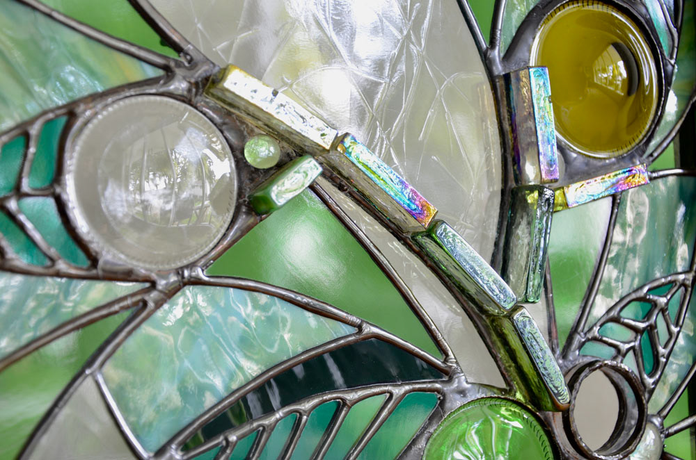 Created as an homage to the cicada (representing rebirth and renewal), this piece was an experiment to see how long it would take me to make exactly one square foot of panel. It is highly detailed with very small pieces of cut glass, a ring from a bottle as well as beads and mosaic tiles.