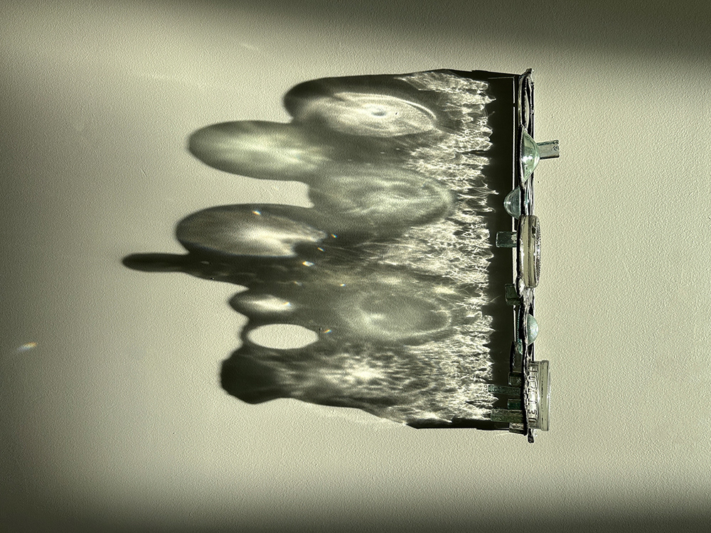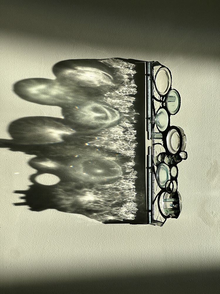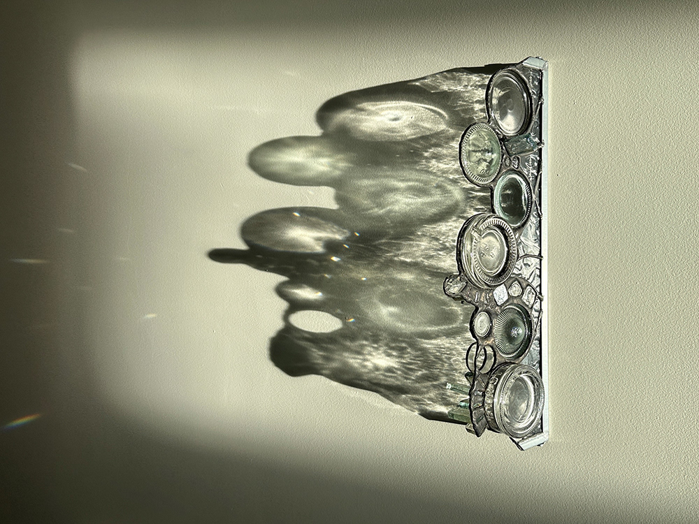 This blade was created with a cityscape in mind. It consists of food and beverage bottles, chandelier crystal, glass mosaic tiles, small beads and textured colourless plate glass.