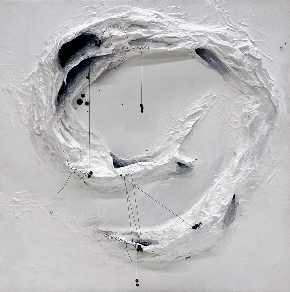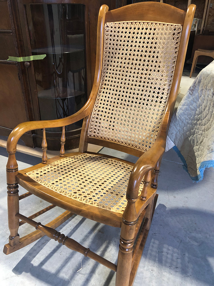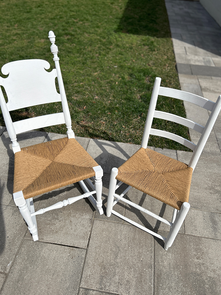 Below are chairs that have been re-woven by hand using materials such as bamboo, reed and paper. The painting is made with modelling paste, tissue, glue, beads, linen thread, crystals and sequins.