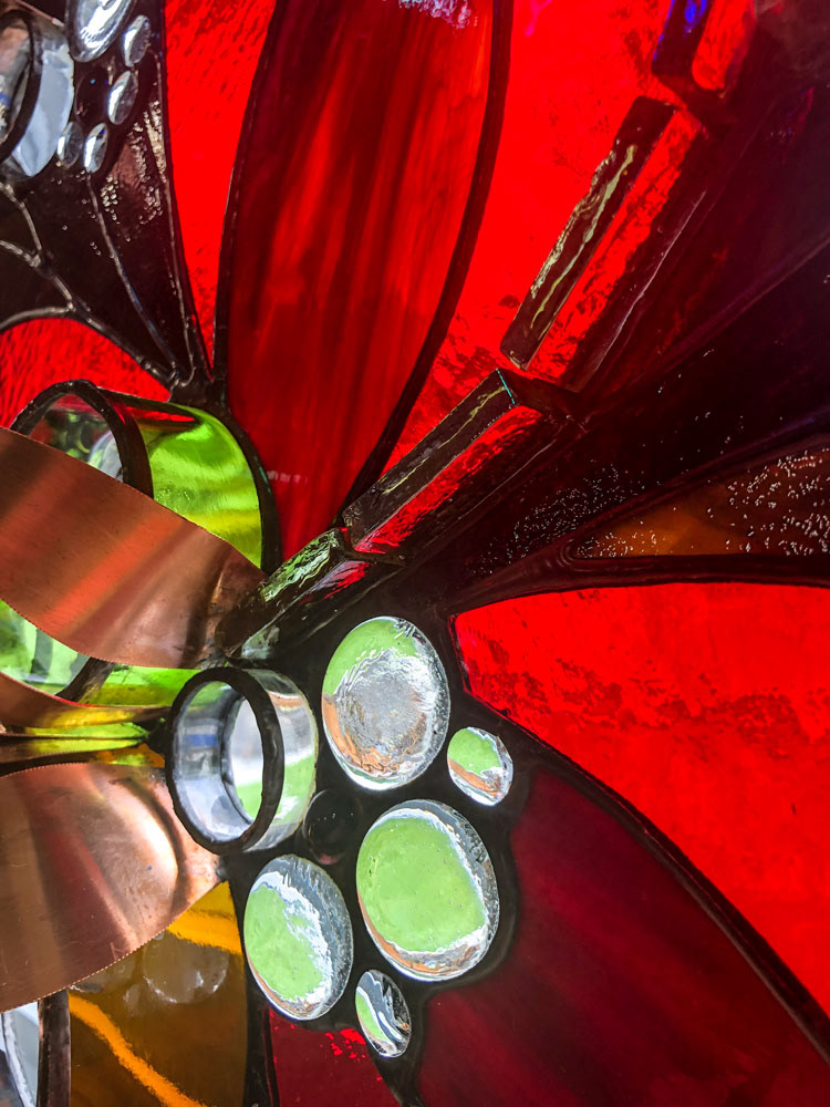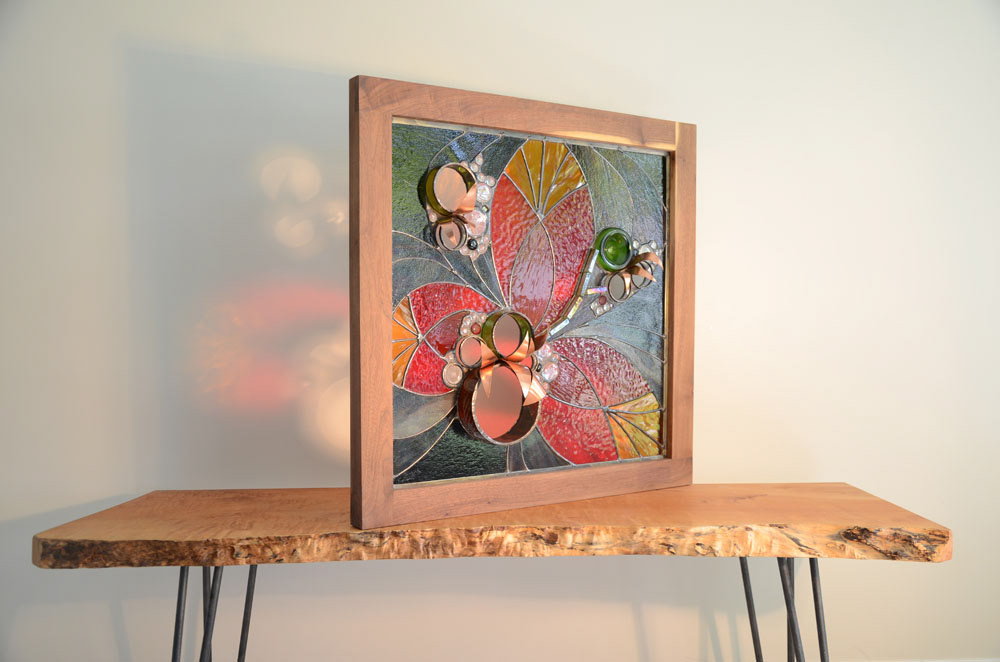 First in a series of 3. Copper sheeting was used to create 3 dimensional elements. The glass used around the red portions is very dark and the image looks quite different when lit from behind.