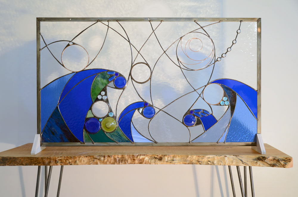 Commissioned for a milestone birthday gift, the theme was chosen to honour a special place on Lake Erie and some of the beads represent the age of the client. A small piece of beach glass from the lake was also included.